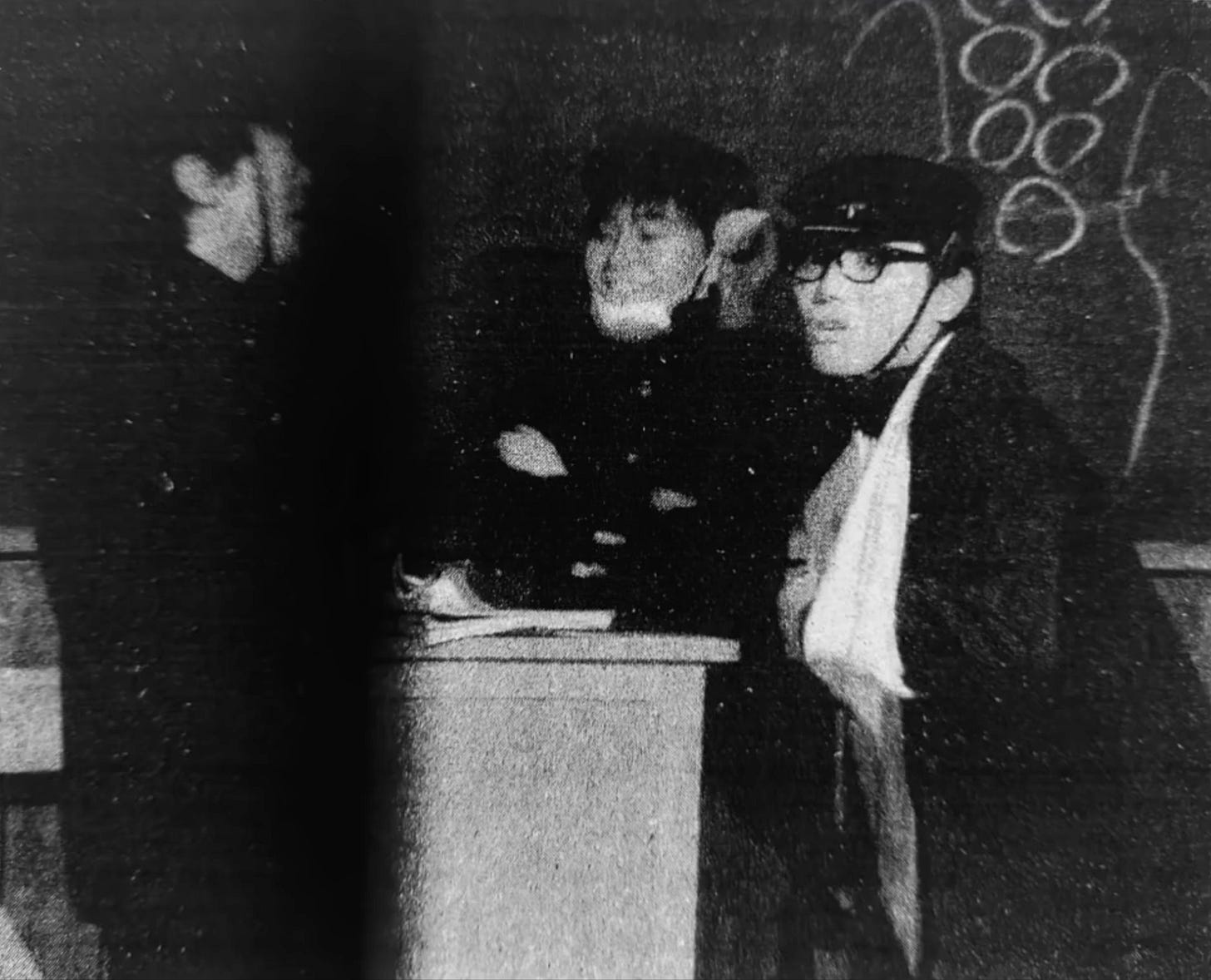 The students collectively respond to the hobo’s chilling laughter by raising a single hand.