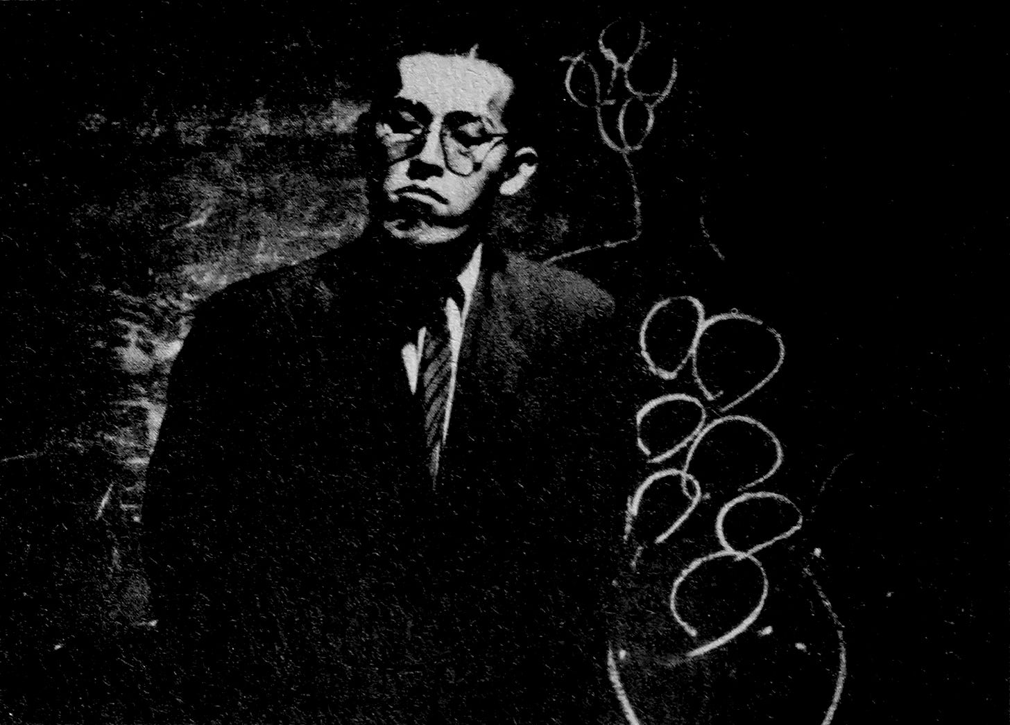 The music builds and the blackboard flips over with a low groaning creak, the students shouting together in excitement. A hobo is resting on the other side of the blackboard, eating from a bento box while dressed in a shredded hakama with a women’s juban. Every inch of his clothing is covered in filth. As soon as the blackboard lands, the hobo opens his mouth and lets out a roaring cackle. His laugh is unnatural, echoing through the stage like a part of the soundtrack rather than coming out as a regular human voice. His laugh is a prerecorded tape, namely a clipping of Vincent Price’s laughter from the ending of Michael Jackson’s Thriller. Each time he laughs, the same recording is played over the speaker system.